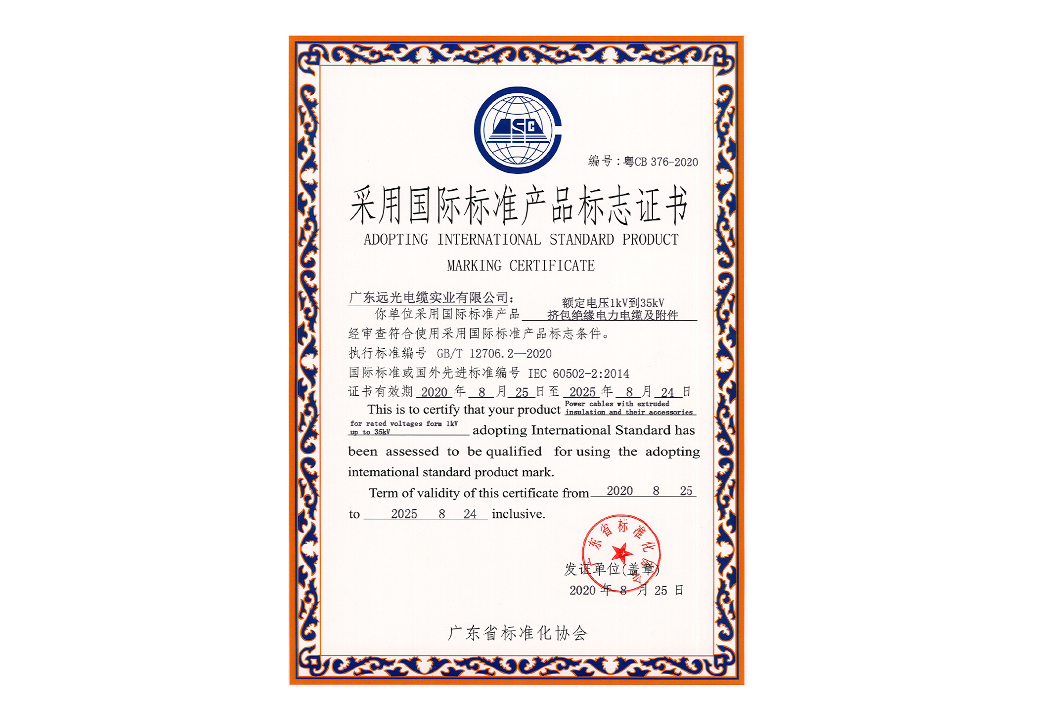 采标证书-额定电压1kV到35kV挤包绝缘电力电缆